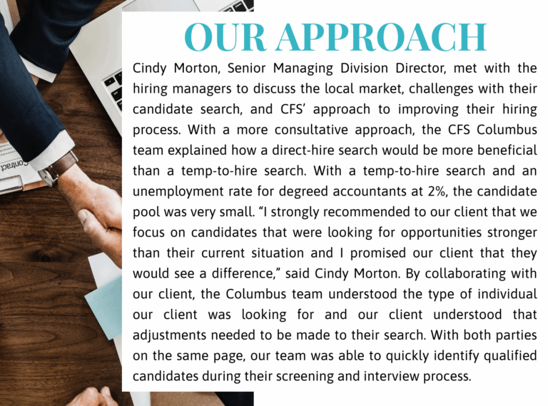 Learn how our Columbus team helped a healthcare company effectively find top talent quickly. For any of your staffing needs, contact CFS today!