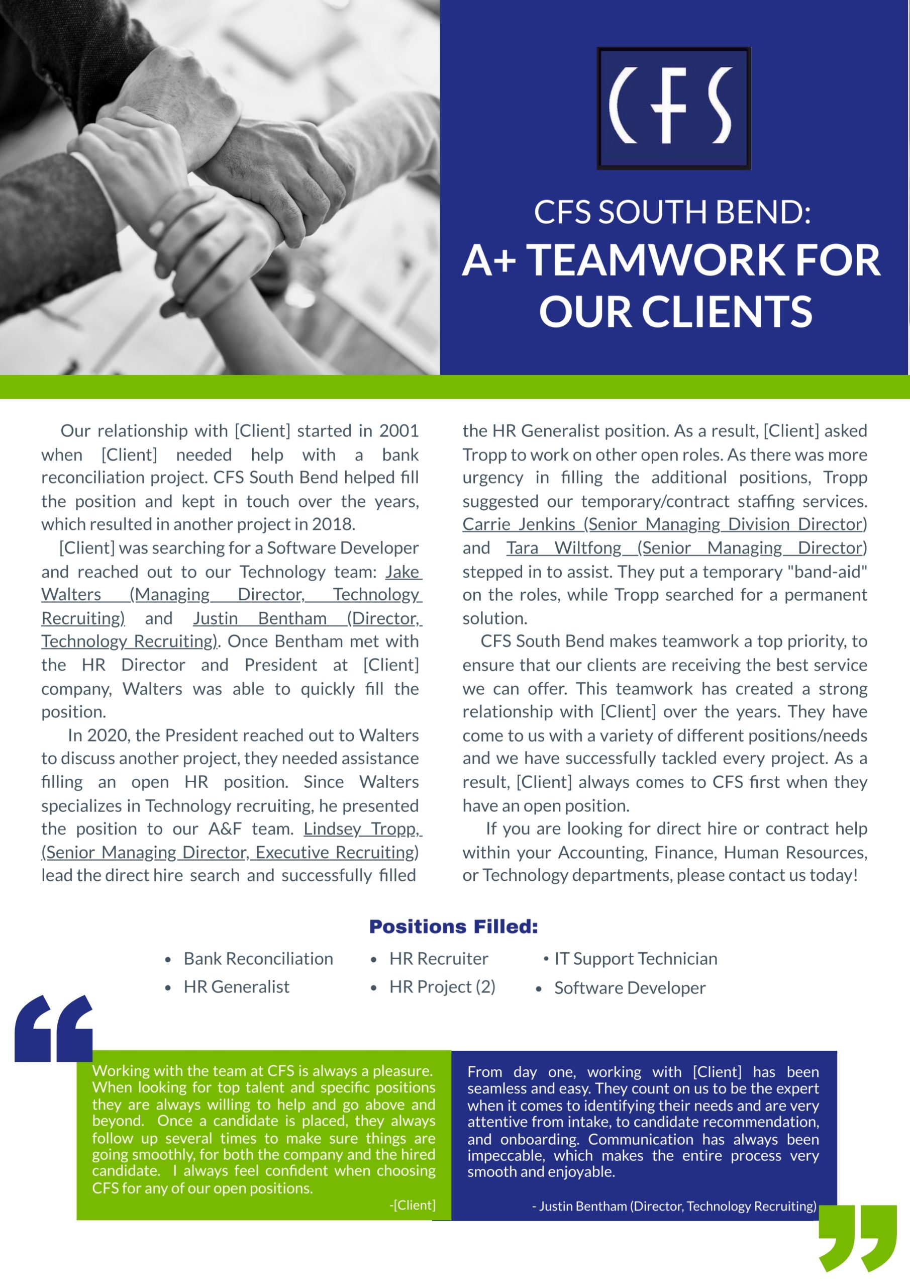 Learn how our South Bend team worked collaboratively to help fill several roles for a long-term client in our latest #SuccessStorySpotlight.
