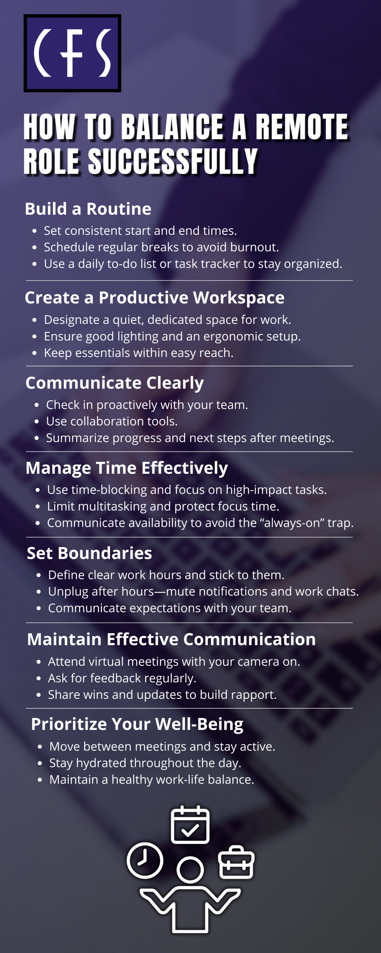 Discover how to thrive in a remote role with proven strategies that help you stay focused, energized, and in control of your workday. For more tips and tricks, contact a CFS recruiter today.