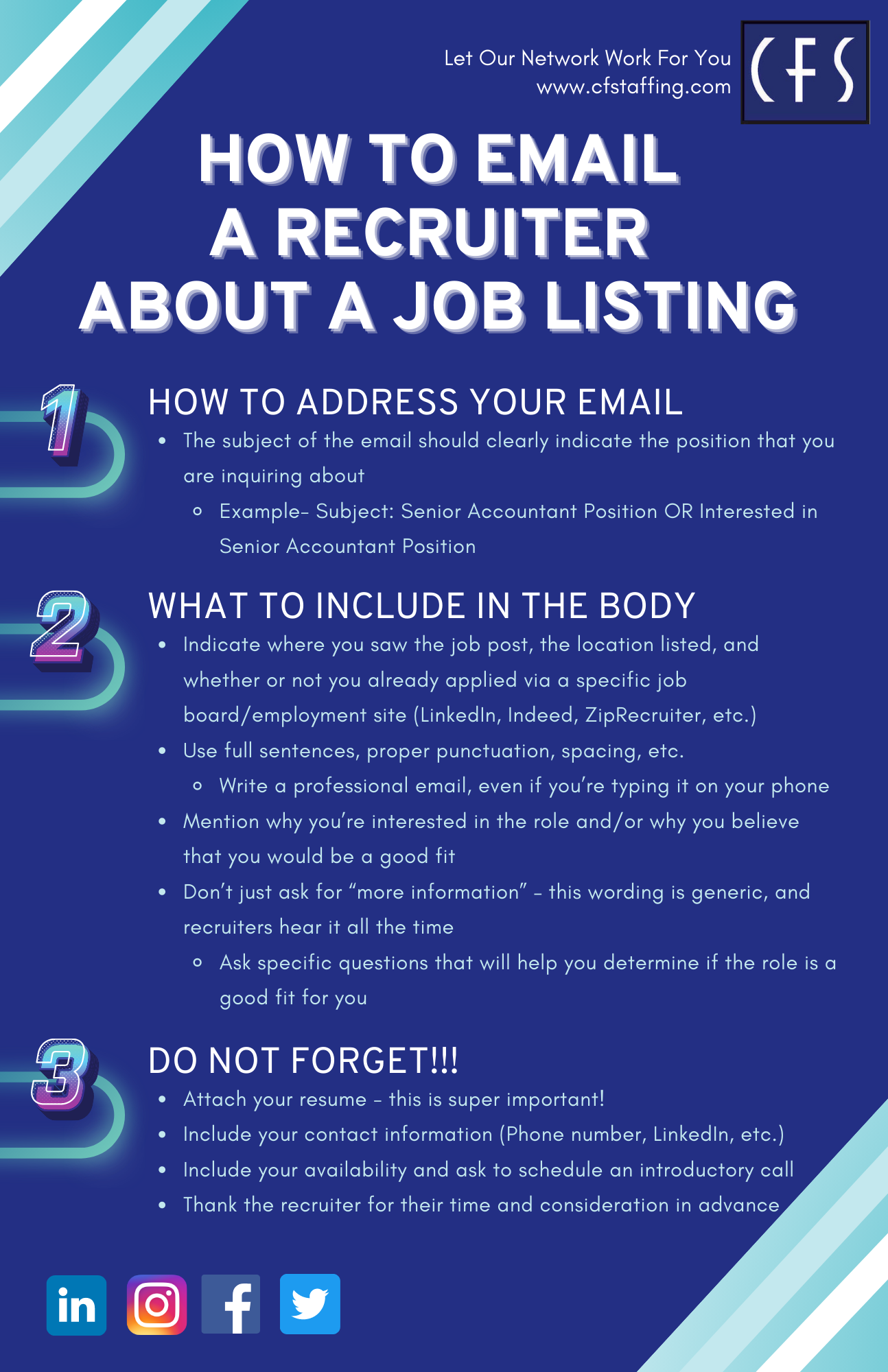 Being thoughtful and strategic when reaching out to a recruiter is critical to your success in the job search process. To help you navigate this process, we’ve shared some helpful steps below. For more tips and tricks, contact a CFS recruiter today.