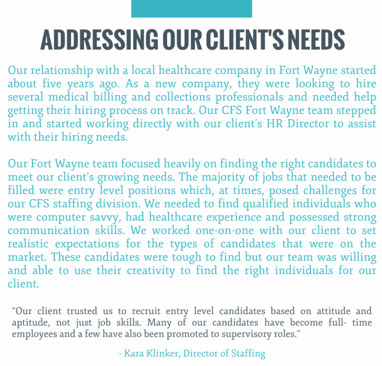 Learn how our Fort Wayne team worked collaboratively to help a local healthcare company fill several entry-level roles in our latest #SuccessStorySpotlight. For any of your staffing needs, contact CFS today!