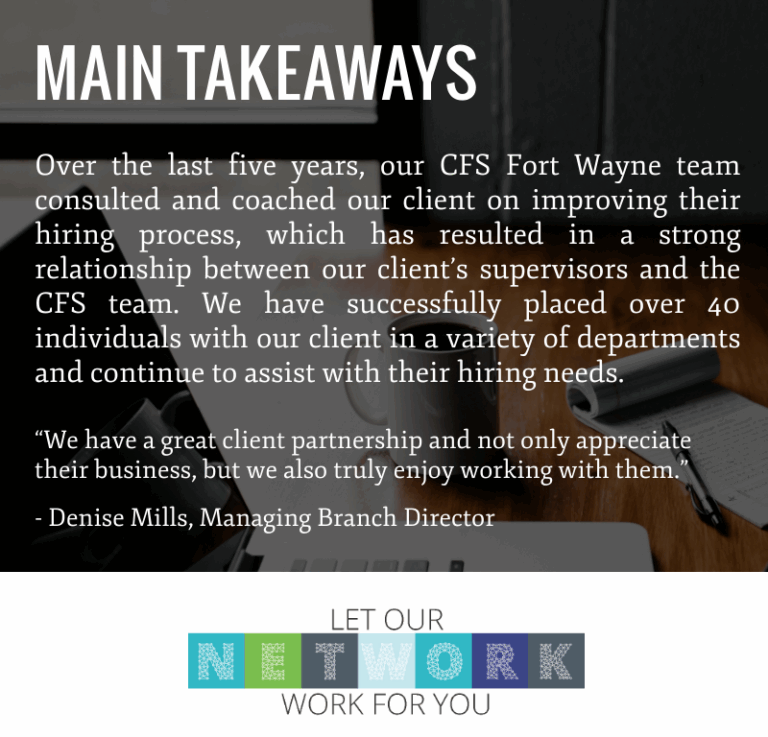 Learn how our South Bend team worked collaboratively to help fill several roles for a long-term client in our latest #SuccessStorySpotlight. For any of your staffing needs, contact CFS today! Click here to download as a PDF