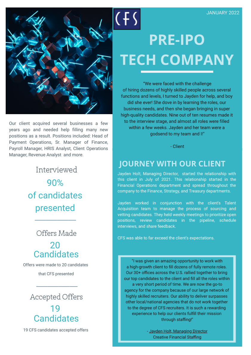 In our latest #SuccessStorySpotlight, Jayden Holt discusses how she assisted a Pre-IPO Tech Company hire 15+ people as a result of their recent business acquisitions. For any of your staffing needs, contact CFS today!