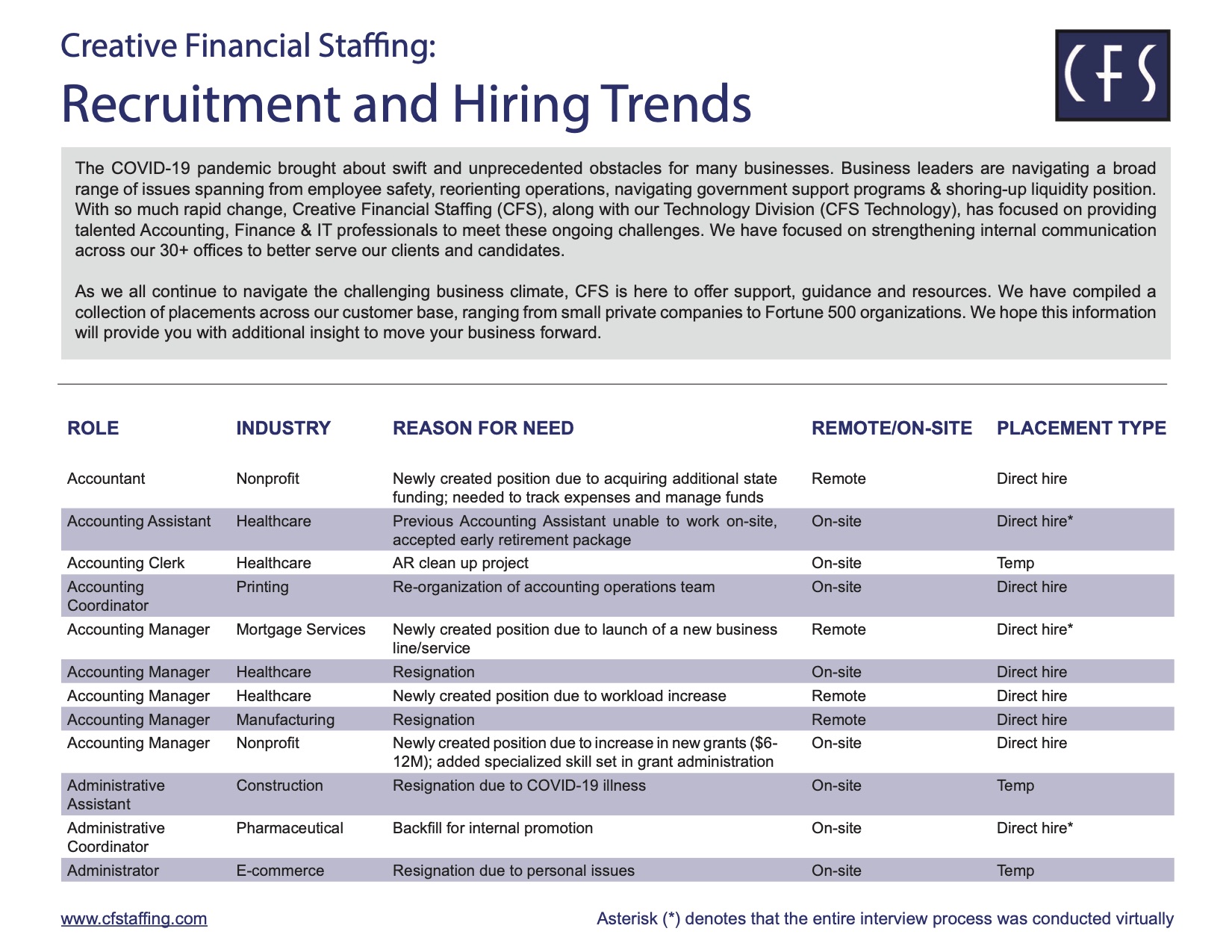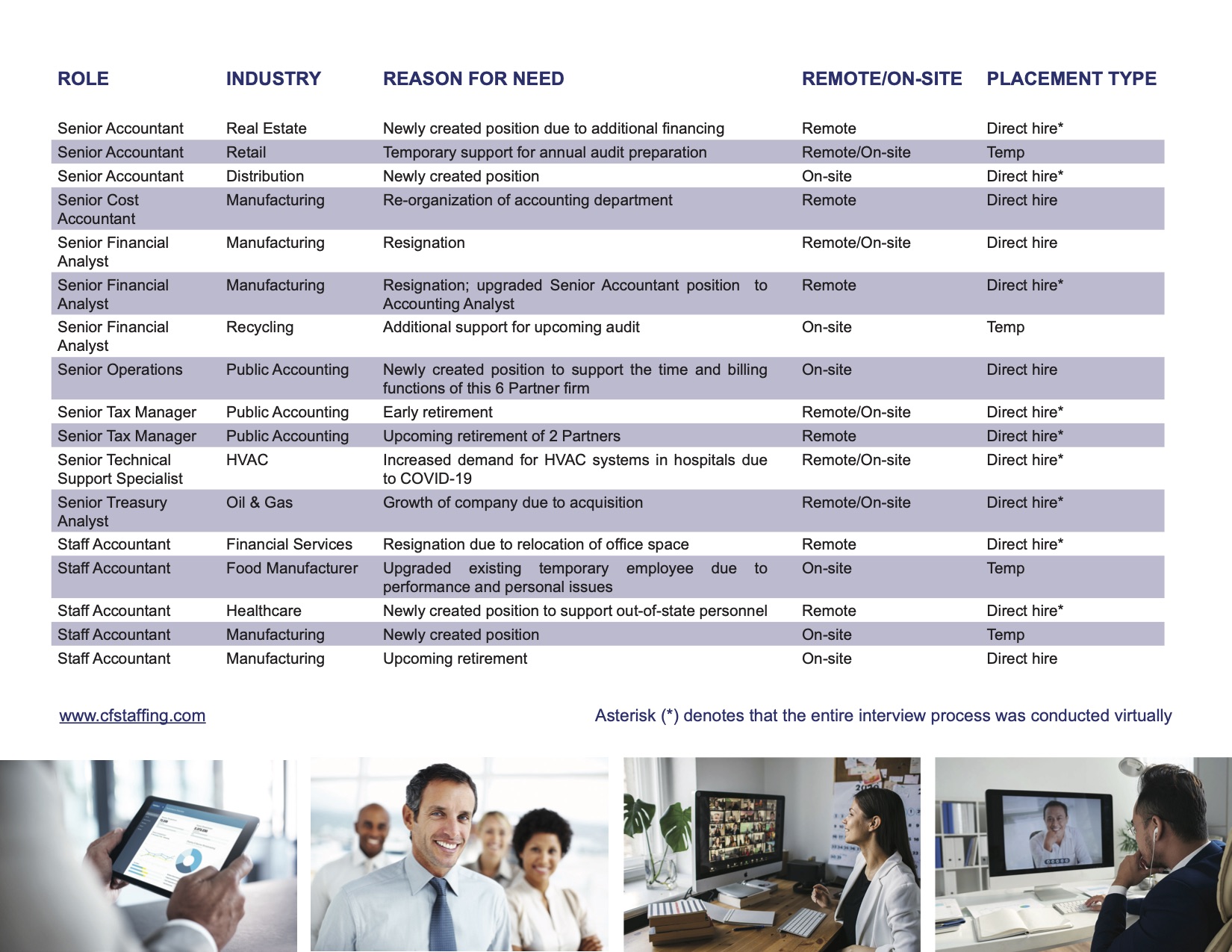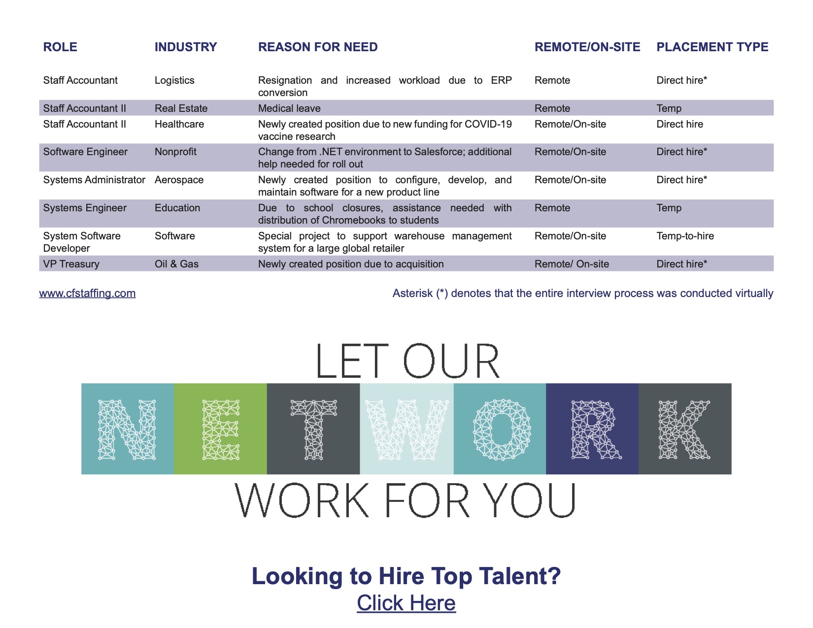 As we all continue to navigate the challenging business climate, CFS is here to offer support, guidance and resources. We compiled a list of Accounting, Finance, and IT placements across our customer base, ranging from small private companies to Fortune 500 organizations during the COVID-19 pandemic. We hope this information will provide you with additional insight to move your business forward. For additional assistance, connect with a CFS recruiter today.