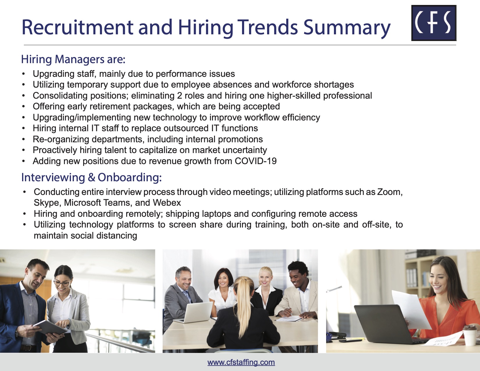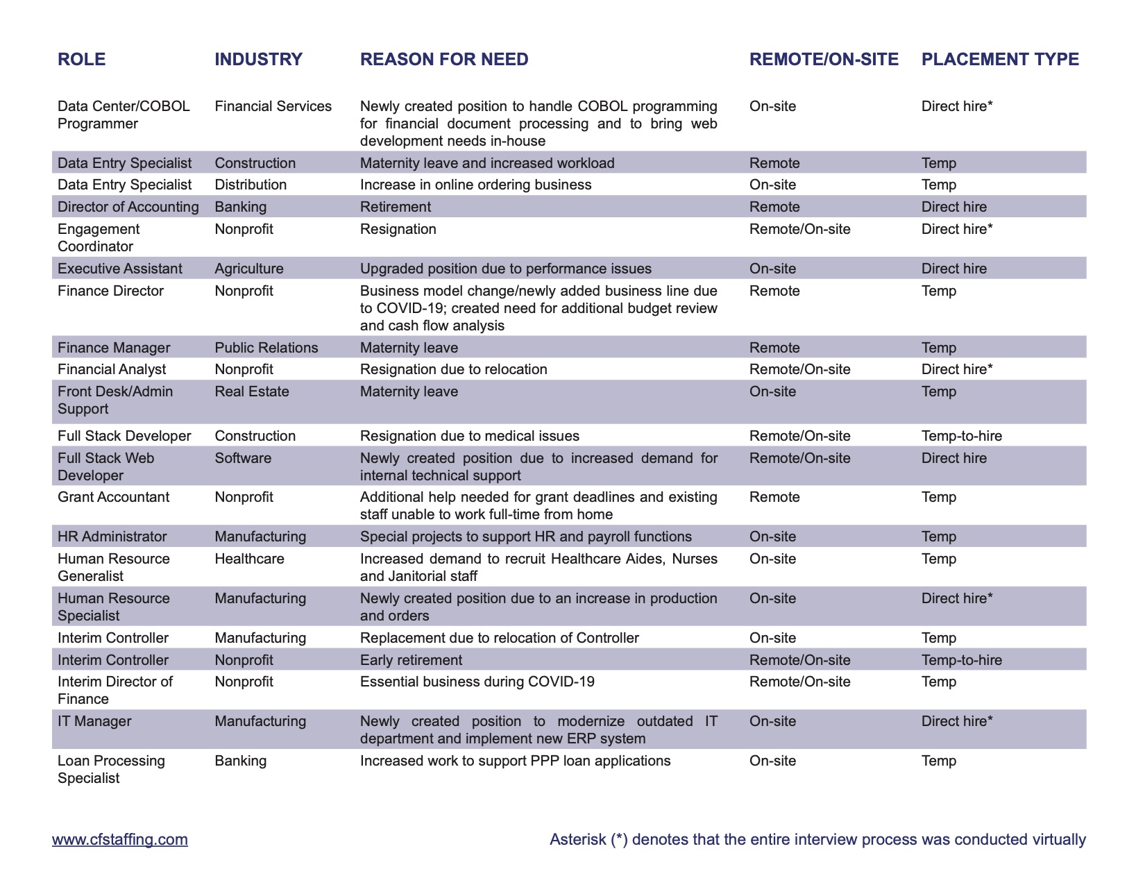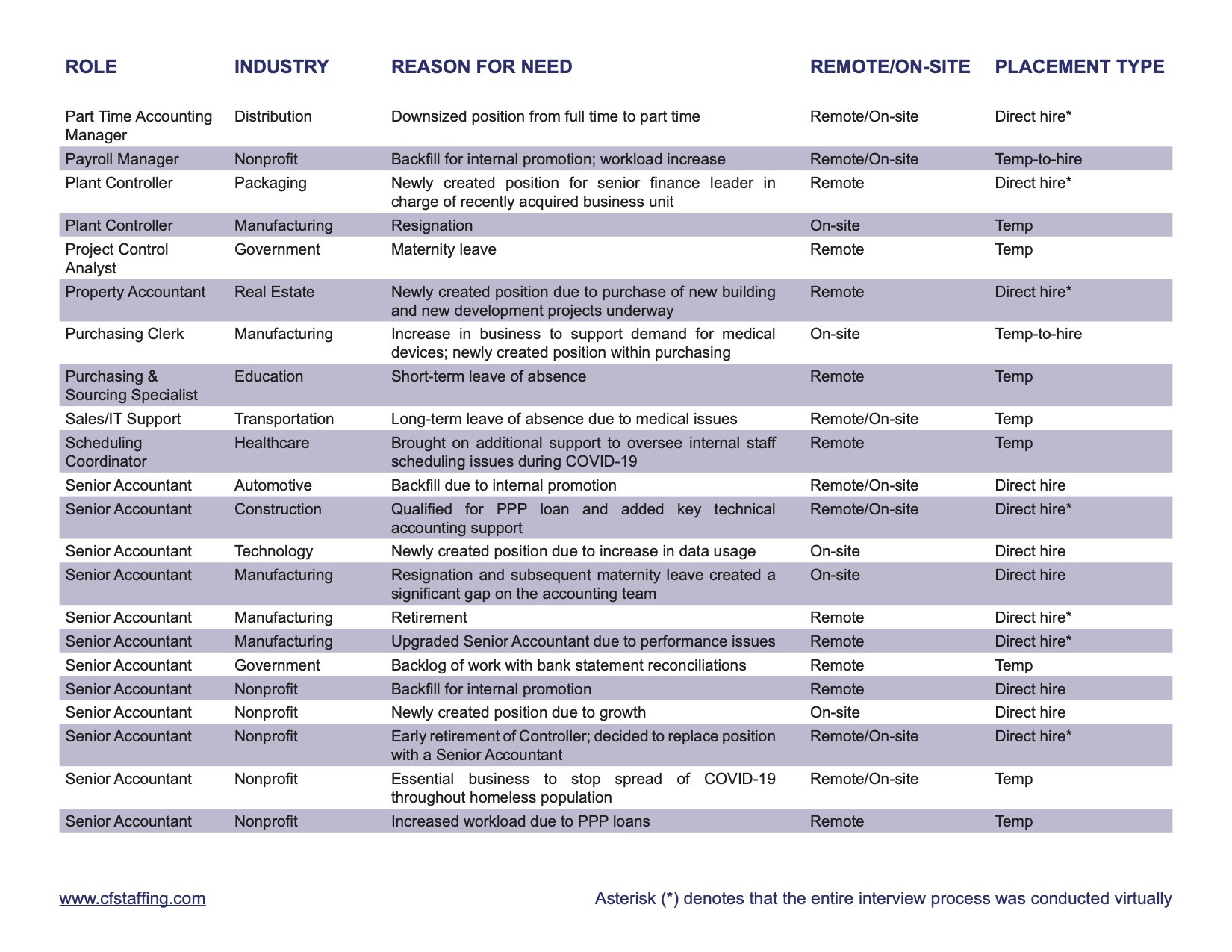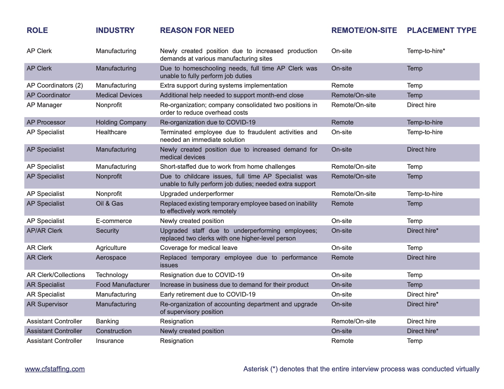 As we all continue to navigate the challenging business climate, CFS is here to offer support, guidance and resources. We compiled a list of Accounting, Finance, and IT placements across our customer base, ranging from small private companies to Fortune 500 organizations during the COVID-19 pandemic. We hope this information will provide you with additional insight to move your business forward. For additional assistance, connect with a CFS recruiter today.