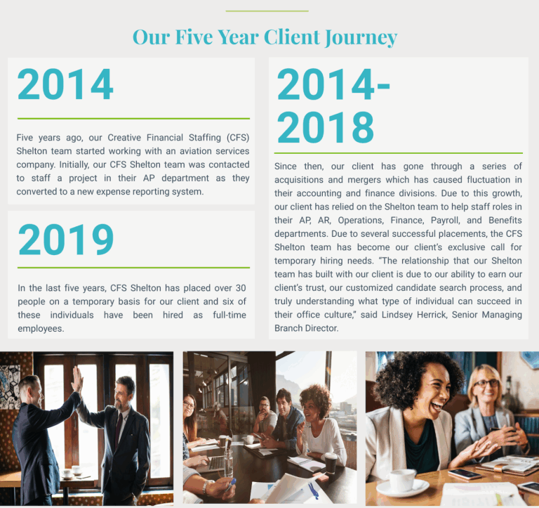 Learn how our Shelton team continues to grow and maintain long-term client relationships. For any of your staffing needs, contact CFS today!